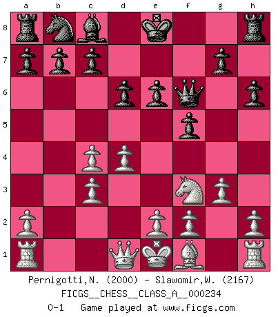 Last move : 0-1 2020 September 5 12:27:26 [Event "FICGS__CHESS__CLASS_A__000234"] [Site "FICGS"] [Date "2020.07.25"] [Round "1"] [White "Pernigotti,Nicolas"] [Black "Slawomir,Weglicki"] [Result "0-1"] [WhiteElo "2000"] [BlackElo "2167"] 1.Nf3 f5 2.d4 e6 3.c4 Nf6 4.Nc3 Bb4 5.g3 Bxc3+ 6.bxc3 d6 7.Bg5 h6 8.Bxf6 Qxf6 0-1 This chess game has been lost on time (started : 2020.07.25 17:13:16) Reti v Dutch Player Black won this chess game. Follow this game move after move (download)If your opponent offers you a draw, try to work out why he thinks he's worse off. (Nigel Short) Weshalb minderdergeübte Spieler mit g2-g4 beginnen? Die betreffenden sind unschlüssig, ob sie nun rechts (h4) oder links (f4) beginnen sollen, und in ihrer Ratlosigkeit entschliessen sie sich nach guter Bürgerart dazu, den goldenen Mittelweg zu wählen. (Aaron Nimzowitsch) El Ajedrez es sobre todo, ¡una pelea!. (Emanuel Lasker) L'action d'une oeuvre littéraire se déroule sur un champ de bataille. Les masques et les types du drame moderne correspondent aux pièces du jeu d'échecs. L'intrigue correspond aux coups et aux gambits, c'est à dire aux techniques du jeu telles qu'utilisées et interprétées par les joueurs. Les tactiques et les péripéties [mouvements] correspondent aux coups exécutés par l'adversaire. (Viktor Shklovsky) Programmer - an organism that turns coffee into software. (Anonymous)