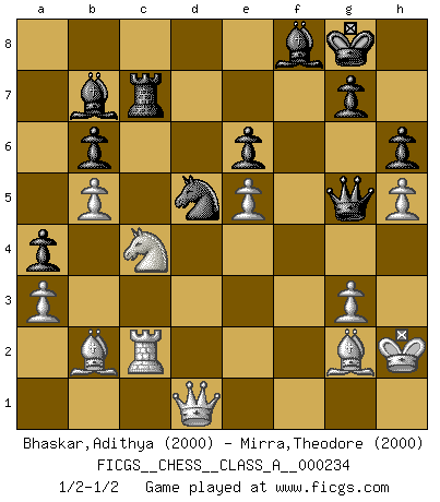 Last move : 1/2-1/2 2020 September 27 21:2:43 [Event "FICGS__CHESS__CLASS_A__000234"] [Site "FICGS"] [Date "2020.07.25"] [Round "1"] [White "Bhaskar,Adithya"] [Black "Mirra,Theodore"] [Result "1/2-1/2"] [WhiteElo "2000"] [BlackElo "2000"] 1.d4 Nf6 2.c4 e6 3.Nf3 b6 4.g3 Ba6 5.b3 Bb4+ 6.Bd2 Be7 7.Bg2 c6 8.Bc3 d5 9.O-O Nbd7 10.Nbd2 O-O 11.Re1 c5 12.cxd5 Nxd5 13.Bb2 Rc8 14.a3 h6 15.Rc1 Bb7 16.dxc5 Rxc5 17.Rxc5 Nxc5 18.b4 Nd7 19.e4 N5f6 20.e5 Nd5 21.Nc4 a5 22.b5 Nc5 23.Nd4 Qc7 24.Qc2 Rc8 25.Rc1 Qd7 26.h4 Qd8 27.Rd1 Qc7 28.Rc1 Qd7 29.Kh2 Qd8 30.h5 Bf8 31.f4 Rc7 32.Qd1 a4 33.f5 Qg5 34.fxe6 Nxe6 35.Nxe6 fxe6 36.Rc2 1/2-1/2 Queen's Indian : Nimzovich variation (exaggerated Fianchetto) Kingside Castling by player White (move 9) Kingside Castling by player Black (move 10) This chess game ended in a draw. Follow this game move after move (download)Chess holds its master in its own bonds, shackling the mind and brain so that the inner freedom of the very strongest must suffer. (Albert Einstein) Wie kann ich Remis annehmen? Ich weiß ja gar nicht, wie ich stehe! (Fritz Sämisch) No hay un Gran Maestro de Ajedrez que sea normal; solo se diferencían ellos por la magnitud de su locura. (Viktor Korchnoi) Le jeu d'échecs est comme rejeté hors du temps. (Antoine de Saint-Exupéry) Either move or be moved. (Ezra Pound)