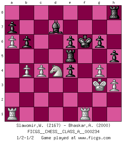 Last move : 1/2-1/2 2020 September 30 19:22:22 [Event "FICGS__CHESS__CLASS_A__000234"] [Site "FICGS"] [Date "2020.07.25"] [Round "1"] [White "Slawomir,Weglicki"] [Black "Bhaskar,Adithya"] [Result "1/2-1/2"] [WhiteElo "2167"] [BlackElo "2000"] 1.e4 c5 2.Nc3 Nc6 3.Nf3 e6 4.d4 cxd4 5.Nxd4 Qc7 6.f4 Nxd4 7.Qxd4 b6 8.Bd2 Bb7 9.Nb5 Qc6 10.Bb4 Nf6 11.Bxf8 Kxf8 12.e5 Qe4+ 13.Be2 Qxd4 14.Nxd4 Ne4 15.a4 Ke7 16.a5 Rhc8 17.a6 Bd5 18.O-O f5 19.Rfc1 d6 20.c4 dxe5 21.fxe5 Bc6 22.g4 g6 23.Bf3 Be8 24.Bxe4 fxe4 25.Kf2 Rc5 26.b4 Rxe5 27.Ke3 h5 28.h3 Rc8 29.Nb3 Bc6 30.Rf1 Rh8 31.Nd4 Bd7 32.Kf4 Kf6 33.Kg3 Ke7 34.Kf4 Kf6 35.Kg3 1/2-1/2 Sicilian : Closed, 2...Nc6 Kingside Castling by player White (move 18) This chess game ended in a draw. Follow this game move after move (download)Every Chess master was once a beginner. (Chernev) Ja, jede Frau in Holland liebt mich bestimmt, und alle Männer hassen mich. (Loek van Wely) El Ajedrez es despiadado: debes de estar preparado para matar gente. (Nigel Short) On peut tirer plus d'utilité d'une partie perdue que de 100 parties gagnées. (Capablanca) Don't anthropomorphize computers - they hate it. (Anonymous)