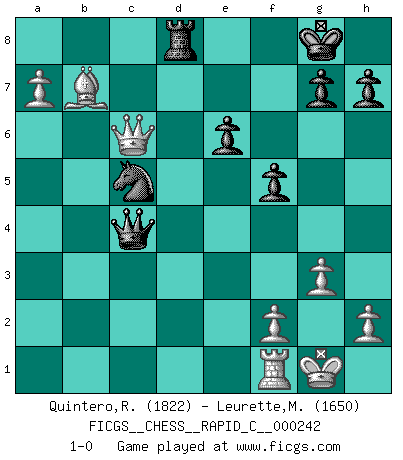 Last move : 1-0 2020 October 5 8:10:26 [Event "FICGS__CHESS__RAPID_C__000242"] [Site "FICGS"] [Date "2020.07.26"] [Round "1"] [White "Quintero,Raul"] [Black "Leurette,Marc-Antoine"] [Result "1-0"] [WhiteElo "1822"] [BlackElo "1650"] 1.Nf3 d5 2.c4 e6 3.g3 Nf6 4.Bg2 c6 5.b3 Nbd7 6.Bb2 Be7 7.O-O O-O 8.e3 a6 9.d4 dxc4 10.bxc4 c5 11.Nbd2 b5 12.Qc2 Rb8 13.Rfc1 Bb7 14.cxb5 cxd4 15.Bxd4 axb5 16.a3 Rc8 17.Qb2 Rxc1+ 18.Rxc1 Bxf3 19.Bxf3 Qb8 20.Ne4 Nxe4 21.Bxe4 f6 22.Qb3 Qd6 23.Qxb5 f5 24.Bg2 Rb8 25.Bb7 Bf6 26.a4 Bxd4 27.exd4 Qxd4 28.a5 Ne5 29.Qb3 Re8 30.a6 Nd3 31.Rf1 Nc5 32.Qb6 Qc4 33.Qc6 Rd8 34.a7 1-0 Reti Opening Kingside Castling by player White (move 7) Kingside Castling by player Black (move 7) Player White won this chess game. Follow this game move after move (download)There just isn't enough televised Chess. (David Letterman) Kein Großmeister ist normal. Sie unterscheiden sich nur im Ausmaß Ihrer Verrücktheit. (Viktor Kortschnoi) La táctica fluye a partir de una posición superior. (Bobby Fischer) Demandez au pauvre Cg1 ce qu'il en pense. Eduard Gufeld à propos de la variante Saemisch de l'Est-Indienne. As the days dwindle down... to a precious few. (Maxwell Anderson)