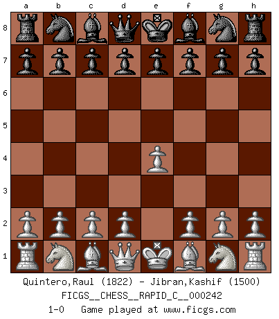 Last move : 1-0 2020 August 28 3:57:33 [Event "FICGS__CHESS__RAPID_C__000242"] [Site "FICGS"] [Date "2020.07.26"] [Round "1"] [White "Quintero,Raul"] [Black "Jibran,Kashif"] [Result "1-0"] [WhiteElo "1822"] [BlackElo "1500"] 1.e4 1-0 This chess game has been lost on time (started : 2020.07.26 14:44:32) King's pawn Opening Player White won this chess game. Follow this game move after move (download)A good sacrifice is one that is not necessarily sound but leaves your opponent dazed and confused. (Rudolph Spielmann) Frage des Reporters: -Welche besonderen Umstände rechtfertigen das Anhalten der Uhren während einer Turnierpartie? Antwort: -Einen Fotographen zu strangulieren. (Siegbert Tarrasch) Después de la respuesta de las negras a 1.e4 con 1..e5, se quedan siempre tratando de entrar dentro del juego. (Howard Staunton) Toutes les manuvres exécutées sur une colonne ouverte ont pour but ultime l'intrusion définitive sur la septième ou la huitième rangée, en plein cur de la position ennemie. (Aaron Nimzovitch) When the going gets tactical, the computers get going. (Hyatt)