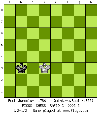 Last move : 1/2-1/2 2021 January 10 16:39:47 [Event "FICGS__CHESS__RAPID_C__000242"] [Site "FICGS"] [Date "2020.07.26"] [Round "1"] [White "Pech,Jaroslav"] [Black "Quintero,Raul"] [Result "1/2-1/2"] [WhiteElo "1786"] [BlackElo "1822"] 1.e4 c5 2.Nf3 d6 3.d4 cxd4 4.Nxd4 Nf6 5.Nc3 a6 6.Be3 e6 7.f3 b5 8.g4 b4 9.Nce2 h6 10.Qd2 Nbd7 11.O-O-O Qc7 12.h4 d5 13.Bg2 dxe4 14.g5 hxg5 15.hxg5 Rxh1 16.Bxh1 Nd5 17.g6 Ne5 18.gxf7+ Qxf7 19.b3 Nxf3 20.Nxf3 exf3 21.Rf1 Be7 22.Bxf3 Bb7 23.Ng3 Bf6 24.Bd4 O-O-O 25.Bxd5 Bxd5 26.Bxf6 gxf6 27.Qxb4 f5 28.Ne4 Bxe4 29.Qxe4 Rd5 30.Qe2 Rd6 31.Kb1 Qg7 32.Rf4 Rc6 33.Qf2 a5 34.a4 Qe5 35.Rd4 Rd6 36.Rc4+ Kb7 37.Qg2+ Kb6 38.Ka2 Rd5 39.Qg1+ Kb7 40.Qh1 Kb8 41.Rh4 Rd2 42.Qc1 Rg2 43.Qd1 Qd5 44.Qxd5 exd5 45.Kb2 Kc7 46.Rh5 Rf2 47.Rh6 f4 48.Ra6 f3 49.Kc3 Rf1 50.Kd2 f2 51.Ke2 Rc1 52.Kxf2 Rxc2+ 53.Ke3 Rc3+ 54.Kd4 Rxb3 55.Rxa5 Kb6 56.Rb5+ Rxb5 57.axb5 Kxb5 58.Kxd5 Kb4 59.Kd4 Kb3 60.Kd3 Kb4 61.Kd4 Kb3 62.Kd3 Kb2 63.Kd2 Kb3 64.Kd3 1/2-1/2 Follow this game move after move (download)Nothing excites jaded Grandmasters more than a theoretical novelty. (Dominic Lawson) Wer wird heute Abend ihr Gegner sein? -- Heute Abend spiele ich gegen die schwarzen Steine. (Akiba Rubinstein) El Ajedrez es como la guerra en un tablero. (Bobby Fischer) La vie et les Echecs sont tous les deux une lutte constante. (Lasker) Internet: Absolute communication, absolute isolation. (Paul Carvel)