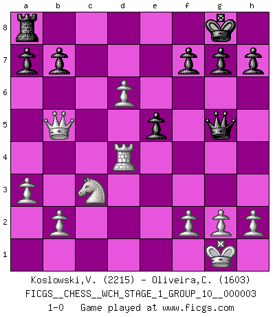 Last move : 1-0 2007 September 16 16:5:32 [Event "FICGS__CHESS__WCH_STAGE_1_GROUP_10__000003"] [Site "FICGS"] [Date "2007.07.11"] [Round "1"] [White "Koslowski,Volker"] [Black "Oliveira,Carlos"] [Result "1-0"] [WhiteElo "2215"] [BlackElo "1603"] 1.e4 c6 2.d4 d5 3.e5 Bf5 4.Nc3 e6 5.Nf3 Nd7 6.Bd3 Bxd3 7.Qxd3 Ne7 8.O-O c5 9.Bg5 Qb6 10.Na4 Qc7 11.c4 dxc4 12.Qxc4 Nc6 13.dxc5 Ndxe5 14.Nxe5 Nxe5 15.Qe2 Nc6 16.Rad1 Be7 17.Bxe7 Qxe7 18.Rd6 O-O 19.Rfd1 Rfd8 20.a3 e5 21.Nc3 Rxd6 22.cxd6 Qg5 23.Qb5 Nd4 24.Rxd4 1-0 Caro-Kann : Advance variation Kingside Castling by player White (move 8) Kingside Castling by player Black (move 18) Player White won this chess game. Follow this game move after move (download)If Chess is a science, it's a most inexact one. If Chess is an art, it is too exacting to be seen as one. If Chess is a sport, it's too esoteric. If Chess is a game, it's too demanding to be just a game. If Chess is a mistress, she's a demanding one. If Chess is a passion, it's a rewarding one. If Chess is life, it's a sad one. (Unknown) Später, ... hatte ich zunehmend Erfolg in entscheidenden Partien. Vielleicht weil ich eine einfache Wahrheit erkannte: nicht nur ich hatte Angst, auch mein Gegner. (Mikhail Nekhemyevich Tal) El Ajedrez se juega con la mente... ¡no con las manos!. (Renaud y Kahn) La vie et les Echecs sont tous les deux une lutte constante. (Lasker) You can think I'm wrong, but that's no reason to quit thinking. (Gregory House, House M.D.)