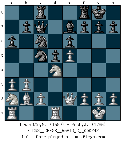 Last move : 1-0 2020 September 15 5:30:40 [Event "FICGS__CHESS__RAPID_C__000242"] [Site "FICGS"] [Date "2020.07.26"] [Round "1"] [White "Leurette,Marc-Antoine"] [Black "Pech,Jaroslav"] [Result "1-0"] [WhiteElo "1650"] [BlackElo "1786"] 1.e4 c6 2.d4 d5 3.e5 Bf5 4.Nf3 e6 5.Nc3 Nd7 6.Bd3 Bxd3 7.Qxd3 c5 8.O-O Ne7 9.dxc5 Nxc5 10.Qe2 Nc6 11.b3 a6 12.Bb2 Be7 13.a3 O-O 14.Rfd1 Qc7 15.Na2 Rac8 16.Nd4 1-0 Caro-Kann : Advance variation Kingside Castling by player White (move 8) Kingside Castling by player Black (move 13) Player White won this chess game. Follow this game move after move (download)Fischer is an American Chess tragedy on par with Morphy and Pillsbury. (Mig Greengard) Gegen einen Schachcomputer zu verlieren ist wie Löcher in den Strümpfen zuhaben. Es ist nicht peinlich, solange man der einzige ist der es weiß. (Anonymous) El Ajedrez no es como la vida... ¡tiene reglas!. (Mark Pasternak) 'L'échange des dames est un coup dur pour les deux adversaires...' Un journaliste lors d'une partie du match Spassky-Fischer Whoever said the pen is mightier than the sword obviously never encountered automatic weapons. (US General Douglas MacArthur)