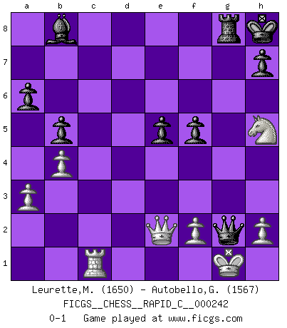 Last move : 0-1 2020 October 11 15:23:26 [Event "FICGS__CHESS__RAPID_C__000242"] [Site "FICGS"] [Date "2020.07.26"] [Round "1"] [White "Leurette,Marc-Antoine"] [Black "Autobello,Giovanni"] [Result "0-1"] [WhiteElo "1650"] [BlackElo "1567"] 1.e4 c5 2.Nf3 d6 3.Bb5+ Bd7 4.Bxd7+ Qxd7 5.d3 Nc6 6.Nc3 e6 7.O-O Nf6 8.Bg5 Be7 9.Re1 O-O 10.d4 cxd4 11.Nxd4 a6 12.Nf3 Rfd8 13.Qd2 b5 14.a3 Rac8 15.b4 Qc7 16.Na2 Ne5 17.Nd4 Nc4 18.Qc1 e5 19.Nf5 Bf8 20.Bxf6 gxf6 21.Nh6+ Kh8 22.Nf5 d5 23.Nc3 dxe4 24.Nxe4 Nd6 25.Nfxd6 Bxd6 26.Nxf6 Qxc2 27.Qe3 Qf5 28.Ne4 Bb8 29.Ng3 Qg6 30.Rac1 f5 31.Qe2 Rxc1 32.Rxc1 Rg8 33.Nh5 Qxg2+ 0-1 Sicilian : Canal-Sokolsky attack, 3...Bd7 Kingside Castling by player White (move 7) Kingside Castling by player Black (move 9) Player Black won this chess game. Follow this game move after move (download)I feel as if I were a piece in a game of Chess, when my opponent says of it: That piece cannot be moved. (Soren Kierkegaard) Viele Opfer benötigen überhaupt keine konkrete Berechnung. Es genügt sich die entstehende Position kurz vorzustellen, um uns davon zu überzeugen, dass das Opfer korrekt ist. (Mikhail Nekhemyevich Tal) El pensamiento metódico es mas útil en el Ajedrez que la inspiración. (C. J. S. Purdy) À la honte des hommes, on sait que les lois du jeu sont les seules qui soient partout justes, claires, inviolables et exécutées. Pourquoi l'Indien qui a donné les règles du jeu d'échecs est-il obéi de bon gré dans toute la terre, et que les décrétales des papes, par exemple, sont aujourd'hui un objet d'horreur et de mépris ? C'est que l'inventeur des échecs combina tout avec justesse pour la satisfaction des joueurs, et que les papes, dans leurs décrétales, n'eurent en vue que leur seul avantage. L'Indien voulut exercer également l'esprit des hommes et leur donner du plaisir; les papes ont voulu abrutir l'esprit des hommes. Voltaire (Dictionnaire philosophique / Garnier 1967) For peace of mind, resign as general manager of the universe. (Douglas Adams)