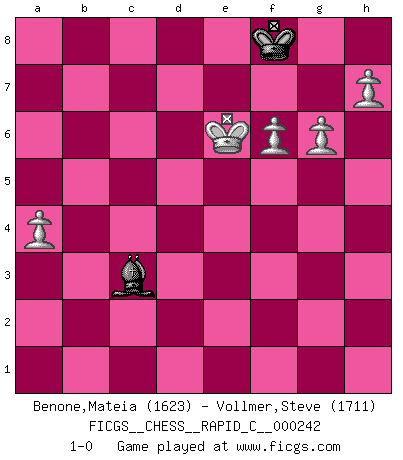 Last move : 1-0 2021 February 6 15:20:26 [Event "FICGS__CHESS__RAPID_C__000242"] [Site "FICGS"] [Date "2020.07.26"] [Round "1"] [White "Benone,Mateia"] [Black "Vollmer,Steve"] [Result "1-0"] [WhiteElo "1623"] [BlackElo "1711"] 1.Nf3 d5 2.d4 c5 3.c4 e6 4.cxd5 exd5 5.g3 Nf6 6.Bg2 Nc6 7.O-O Be7 8.dxc5 Bxc5 9.Bg5 Be7 10.Nc3 Be6 11.Nd4 Qd7 12.e4 dxe4 13.Nxe6 Qxe6 14.Re1 Rd8 15.Qc2 O-O 16.Nxe4 Qd7 17.Rad1 Nd4 18.Qc4 b5 19.Qd3 Nxe4 20.Rxe4 Bxg5 21.Rxd4 Qc7 22.Qxb5 Rxd4 23.Rxd4 Bf6 24.Rd7 Qc1+ 25.Bf1 a6 26.Qd5 Qe1 27.Kg2 Bxb2 28.Bc4 Qe8 29.Bxa6 Kh8 30.a4 f5 31.Bd3 Qe5 32.Qxe5 Bxe5 33.Bxf5 g6 34.Be4 Rf6 35.f4 Bc3 36.Bd3 Rf8 37.Rc7 Bb4 38.Rb7 Bc3 39.Ra7 Rd8 40.Be2 Rd5 41.Kf3 Ra5 42.Rxa5 Bxa5 43.Ke4 Kg7 44.g4 Kf6 45.g5+ Ke6 46.Bc4+ Ke7 47.Bg8 Kf8 48.Bxh7 Kg7 49.Bxg6 Kxg6 50.h4 Be1 51.f5+ Kf7 52.h5 Bd2 53.f6 Bc3 54.Kf5 Kg8 55.g6 Bb4 56.h6 Bc3 57.Ke6 Kf8 58.h7 1-0 Follow this game move after move (download)In order to improve your game, you must study the endgame before everything else, for whereas the endings can be studied and mastered by themselves, the middle game and the opening must be studied in relation to the endgame. (Jose Raul Capablanca) Zeige mir drei Eröffnungsvarianten und ich beweise dir, dass zwei davon inkorrekt sind. (Emanuel Lasker) Puntos débiles o agujeros en la posición de tu oponente deben de ser ocupados por piezas, no Peones. (Siegbert Tarrasch) Des combinaisons [dans le jeu d'échecs] pareilles à des mélodies. Je crois entendre pour ainsi dire la musique des coups... (Vladimir Nabokov) There is no vagueness without wind. (Chinese proverb)