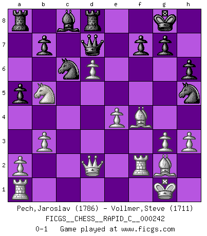 Last move : 0-1 2020 October 1 12:9:5 [Event "FICGS__CHESS__RAPID_C__000242"] [Site "FICGS"] [Date "2020.07.26"] [Round "1"] [White "Pech,Jaroslav"] [Black "Vollmer,Steve"] [Result "0-1"] [WhiteElo "1786"] [BlackElo "1711"] 1.c4 e5 2.Nc3 Nf6 3.Nf3 Nc6 4.g3 Bc5 5.Bg2 O-O 6.d3 h6 7.O-O a5 8.Nxe5 Bxf2+ 9.Rxf2 Nxe5 10.b3 d6 11.h3 c6 12.e4 c5 13.d4 cxd4 14.Qxd4 Qe7 15.Bf4 Rd8 16.c5 Qe8 17.cxd6 Nc6 18.Qd2 Nh5 19.Nb5 Qd7 0-1 This chess game has been lost on time (started : 2020.07.26 14:44:32) English Opening Kingside Castling by player Black (move 5) Kingside Castling by player White (move 7) Player Black won this chess game. Follow this game move after move (download)For surely of all the drugs in the world, Chess must be the most permanently pleasurable. (Assiac) Schach wird sich dank seiner hohen kulturellen Tradition immer durchsetzen. In näherer Zukunft womöglich sogar als Gegenreaktion auf die maßlose Reizüberflutung im Freizeit- und Spielbereich. (Garry Kasparov) El Ajedrez es tortura mental. (Garry Kasparov) La conception d'un plan est le processus par lequel un joueur exploite les avantages de sa position tout en s'efforçant d'en réduire au minimum les inconvénients. Afin de garantir le succès, un plan doit toujours se fonder sur un diagnostic objectif des particularités d'une position. La conception d'un plan est d'autant plus difficile que la position est équilibrée, et grandement facilitée lorsqu'il n'existe qu'un seul plan susceptible de répondre aux exigences de la position. (Harry Golombek) Mandala - that's it! 16x16 squares as multiple of the four and the eight because of the Four Noble Truths and the Noble Eightfold Path. (Heinz-Georg Lehnhoff about Big Chess)