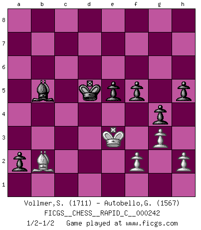 Last move : 1/2-1/2 2020 November 17 23:19:41 [Event "FICGS__CHESS__RAPID_C__000242"] [Site "FICGS"] [Date "2020.07.26"] [Round "1"] [White "Vollmer,Steve"] [Black "Autobello,Giovanni"] [Result "1/2-1/2"] [WhiteElo "1711"] [BlackElo "1567"] 1.c4 c5 2.Nf3 Nf6 3.g3 g6 4.Bg2 Bg7 5.O-O O-O 6.Nc3 Nc6 7.d3 d5 8.cxd5 Nxd5 9.Nxd5 Qxd5 10.Be3 Bxb2 11.Ng5 Qd6 12.Rb1 Bg7 13.Ne4 Qe6 14.Nxc5 Qxa2 15.Nxb7 Bd7 16.Nc5 Be8 17.Rb7 e6 18.Ne4 Nd4 19.Nc3 Qa5 20.Bd2 Qd8 21.e3 Nc6 22.d4 a5 23.Qe2 Rb8 24.Rfb1 Rxb7 25.Rxb7 Nb4 26.Qc4 Bd7 27.Qc7 Qxc7 28.Rxc7 Rd8 29.Ne4 Nd5 30.Ra7 a4 31.Nc5 Bc6 32.e4 Bxd4 33.exd5 Bxc5 34.Rc7 Bxd5 35.Rxc5 Bxg2 36.Bg5 Rd5 37.Rxd5 Bxd5 38.Bf6 a3 39.Kf1 Bf3 40.Ke1 a2 41.Kd2 g5 42.Kc2 g4 43.Kd2 h5 44.Ke3 Kh7 45.Kf4 Kg6 46.Bc3 f6 47.Bb2 e5+ 48.Ke3 Kf5 49.Bc3 Ke6 50.Bb2 Kd5 51.Kd3 f5 52.Ke3 Be4 53.Bc3 Bc2 54.Bb2 Bb3 55.Bc3 Bc4 56.Bb2 Bb5 1/2-1/2 Follow this game move after move (download)The isolated Pawn casts gloom over the entire chessboard. (Aaron Nimzovich) Das Blackmar-Diemer-Gambit verändert den ganzen Menschen! (Emil Joseph Diemer) La batalla por la última verdad nunca sera ganada. Y es por eso que el Ajedrez es tan fascinante. (Hans Kmoch) Demandez au pauvre Cg1 ce qu'il en pense. Eduard Gufeld à propos de la variante Saemisch de l'Est-Indienne. Memory is a way of holding onto the things you love, the things you are, the things you never want to lose. (from the television show: The Wonder Years)