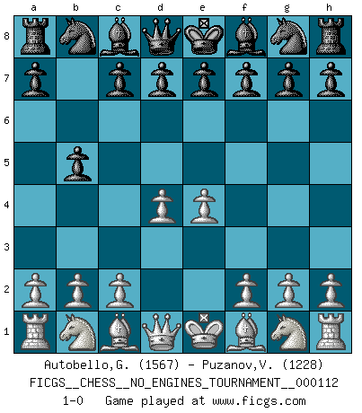 Last move : 1-0 2020 September 10 0:7:15 [Event "FICGS__CHESS__NO_ENGINES_TOURNAMENT__000112"] [Site "FICGS"] [Date "2020.07.30"] [Round "1"] [White "Autobello,Giovanni"] [Black "Puzanov,Vasyl"] [Result "1-0"] [WhiteElo "1567"] [BlackElo "1228"] 1.d4 b5 2.e4 1-0 This chess game has been lost on time (started : 2020.07.30 23:24:16) Polish defense Player White won this chess game. Follow this game move after move (download)A Chess game is divided into three stages: the first, when you hope you have the advantage, the second when you believe you have an advantage, and the third... when you know you're going to lose ! (Savielly Tartakower) Ich verachte die Medien. (Robert James Fischer) El jugador de combinación piensa hacia adelante; comienza de la posición dada y trabaja las movidas contundentes en su mente. (Emanuel Lasker) Toutes les manuvres exécutées sur une colonne ouverte ont pour but ultime l'intrusion définitive sur la septième ou la huitième rangée, en plein cur de la position ennemie. (Aaron Nimzovitch) You can only get smarter by playing a smarter opponent. (Revolver, movie)