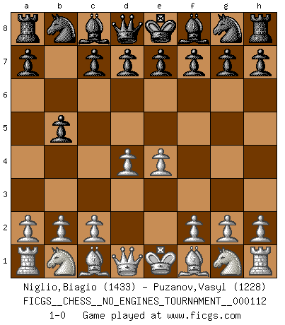 Last move : 1-0 2020 September 10 0:7:15 [Event "FICGS__CHESS__NO_ENGINES_TOURNAMENT__000112"] [Site "FICGS"] [Date "2020.07.30"] [Round "1"] [White "Niglio,Biagio"] [Black "Puzanov,Vasyl"] [Result "1-0"] [WhiteElo "1433"] [BlackElo "1228"] 1.d4 b5 2.e4 1-0 This chess game has been lost on time (started : 2020.07.30 23:24:16) Polish defense Player White won this chess game. Follow this game move after move (download)Pawns: they are the soul of this game, they alone form the attack and defense. (Philidor) Schachspieler können ausgezeichnet Varianten am Schachbrett berechnen, aber nicht im realen Leben. Zu stark ist der Individualismus im Schach ausgeprägt, und für viele ist ein kleiner momentaner persönlicher Vorteil wichtiger als ein weit größerer Vorteil von morgen. (Anatoly Karpov) Yo nunca en mi vida he jugado la Defensa Francesa, que viene siendo la más aburrida de todas las Aperturas. (Wilhelm Steinitz) Donnez-moi un Cavalier en 6e et je gagnerais toutes mes parties. (Steinitz) Nobody is always a winner, and anybody who says he is, is either a liar or doesn't play poker. (Amarillo Slim)