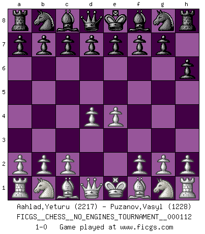 Last move : 1-0 2020 September 11 1:3:8 [Event "FICGS__CHESS__NO_ENGINES_TOURNAMENT__000112"] [Site "FICGS"] [Date "2020.07.30"] [Round "1"] [White "Aahlad,Yeturu"] [Black "Puzanov,Vasyl"] [Result "1-0"] [WhiteElo "2217"] [BlackElo "1228"] 1.e4 h6 2.d4 1-0 This chess game has been lost on time (started : 2020.07.30 23:24:16) Carr's defense Player White won this chess game. Follow this game move after move (download)Chess is not like life... it has rules ! (Mark Pasternak) Man wirke der falschen Auffassung entgegen, als ob jeder Zug Unmittelbares zu leisten habe; auch Werte- und Ruhezüge haben ihre Existenzberechtigung. (Aaron Nimzowitsch) Hay dos clases de hombres: aquellos que se conforman en dejarse llevar por las circunstancias y que juegan barajas y aquellos decididos a controlar las circunstancias y que juegan al Ajedrez. (Mortimer Collins) Un footballeur joue avec ses pieds, parfois avec sa tête. Un joueur d'échecs ne joue qu'avec sa tête. Et quand il ne joue plus, il meurt. (Jacob Murray) Over-the-board chess is the favorite of mortals, correspondence chess is the favorite of the gods. (Eduard Dyckhoff)