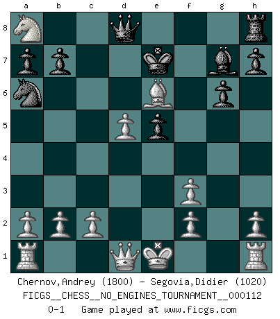Last move : 0-1 2020 November 14 19:0:3 [Event "FICGS__CHESS__NO_ENGINES_TOURNAMENT__000112"] [Site "FICGS"] [Date "2020.07.30"] [Round "1"] [White "Chernov,Andrey"] [Black "Segovia,Didier"] [Result "0-1"] [WhiteElo "1800"] [BlackElo "1020"] 1.e4 e5 2.Nf3 d6 3.d4 Bg4 4.dxe5 Bxf3 5.gxf3 Ne7 6.exd6 cxd6 7.Bf4 g6 8.Na3 Nec6 9.Nb5 d5 10.Nc7+ Ke7 11.Nxa8 Bg7 12.exd5 Ne5 13.Bg5+ f6 14.Bf4 Kf7 15.Bxe5 fxe5 16.Bh3 Na6 17.Be6+ Ke7 0-1 Follow this game move after move (download)Half the variations which are calculated in a tournament game turn out to be completely superfluous. Unfortunately, no one knows in advance which half. (Jan Tinman) Ein guter Spieler hat immer Glück. (José Raúl Capablanca) El Ajedrez es la vida. (Bobby Fischer) En blitz, le Cavalier l'emporte sur le Fou. (Vlastimil Hort) Pushing plastic is for the many, pushing virtual pieces is for the fewer, pushing wood is for the very few. (Normajean Yates)