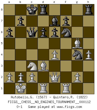 Last move : 0-1 2020 November 14 19:0:3 [Event "FICGS__CHESS__NO_ENGINES_TOURNAMENT__000112"] [Site "FICGS"] [Date "2020.07.30"] [Round "1"] [White "Autobello,Giovanni"] [Black "Quintero,Raul"] [Result "0-1"] [WhiteElo "1567"] [BlackElo "1822"] 1.e4 c5 2.Nf3 d6 3.d4 cxd4 4.Nxd4 Nf6 5.Nc3 a6 6.Bg5 e6 7.f4 Be7 8.Qf3 Qc7 9.O-O-O Nbd7 10.Bd3 h6 11.Bh4 g5 12.fxg5 Ne5 13.Qe2 hxg5 14.Bxg5 Bd7 15.h4 O-O-O 16.Rhf1 Neg4 17.Kb1 Bc6 18.Nxc6 Qxc6 0-1 This chess game has been lost on time (started : 2020.07.30 23:24:16) Follow this game move after move (download)Though most people love to look at the games of the great attacking masters, some of the most successful players in history have been the quiet positional players. They slowly grind you down by taking away your space, tying up your pieces, and leaving you with virtually nothing to do ! (Yasser Seirawan) Frage des Reporters: -Welche besonderen Umstände rechtfertigen das Anhalten der Uhren während einer Turnierpartie? Antwort: -Einen Fotographen zu strangulieren. (Siegbert Tarrasch) Cuando tengo las piezas blancas, yo gano porque soy blanco; Cuando tengo las piezas negras, yo gano porque soy Bogolyubov. (Bogolyubov) Comme les marins qui ont mille raisons différentes d'aller en mer, les joueurs d'échecs en ont tout autant avant de s'installer devant une table et jouer... (Vincent Bertignac, philosophe) Wisdom begins at the end. (Daniel Webster)