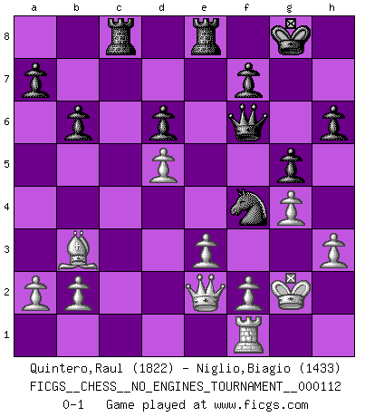 Last move : 0-1 2020 October 20 8:52:9 [Event "FICGS__CHESS__NO_ENGINES_TOURNAMENT__000112"] [Site "FICGS"] [Date "2020.07.30"] [Round "1"] [White "Quintero,Raul"] [Black "Niglio,Biagio"] [Result "0-1"] [WhiteElo "1822"] [BlackElo "1433"] 1.d4 Nf6 2.Bf4 g6 3.h3 Bg7 4.e3 O-O 5.Bd3 d6 6.Nf3 Nbd7 7.O-O Re8 8.c3 e5 9.Bg5 e4 10.Bc2 exf3 11.Qxf3 h6 12.Bh4 Rb8 13.Nd2 b6 14.Rfe1 Bb7 15.Qe2 Rc8 16.Bb3 c5 17.g4 g5 18.Bg3 cxd4 19.cxd4 Nf8 20.Nc4 Ba6 21.d5 Ng6 22.Rac1 Ne4 23.Bh2 Be5 24.Qf3 Bxh2+ 25.Kxh2 Bxc4 26.Rxc4 Nd2 27.Qe2 Nxc4 28.Bxc4 Ne5 29.Bb3 Qf6 30.Kg2 Ng6 31.Rf1 Nf4+ 0-1 Queen's pawn game Kingside Castling by player Black (move 4) Kingside Castling by player White (move 7) Player Black won this chess game. Follow this game move after move (download)Fischer prefers to enter Chess history alone. (Miguel Najdorf) Sicherlich können nur Meister einen Stil haben. Daß ein nicht-Meister auch nur ein einziges Mal in seinem Leben eine Partie folgerecht durchführte, habe ich niemals bemerkt. (Emanuel Lasker) Repentinamente, me resultaba obvio en mi analisis que yo habÃa pasado por alto lo que Fischer habÃa visto en el tablero con la mas grande facilidad. (Mikhail Botvinnik) Roi des jeux et jeu des rois, les échecs portent en eux un sentiment d'infini. Ils donnent à celui qui s'est efforcé d'en approfondir les arcanes l'impression de n'être pas à la mesure de l'homme; en fait, ils constituent un résumé de l'univers, un microcosme, et figurent cette grande échelle qui, dans les plans de la lumière descend jusqu'à la matière, qui des abîmes insondables remonte jusqu'en l'infini de Dieu. (Pyrame) Perfection is achieved, not when there is nothing more to add, but when there is nothing left to take away. (Antoine de Saint-Exupéry)