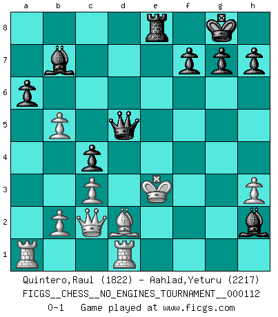 Last move : 0-1 2021 January 18 5:54:58 [Event "FICGS__CHESS__NO_ENGINES_TOURNAMENT__000112"] [Site "FICGS"] [Date "2020.07.30"] [Round "1"] [White "Quintero,Raul"] [Black "Aahlad,Yeturu"] [Result "0-1"] [WhiteElo "1822"] [BlackElo "2217"] 1.e4 e5 2.Nf3 Nc6 3.Bb5 a6 4.Ba4 Nf6 5.d3 b5 6.Bb3 Bc5 7.h3 O-O 8.c3 d5 9.Nbd2 dxe4 10.Nxe4 Nxe4 11.O-O Nf6 12.Nxe5 Nxe5 13.d4 Bd6 14.dxe5 Bxe5 15.Qc2 c5 16.Rd1 Qc7 17.Bd5 Nxd5 18.Rxd5 Bb7 19.Rd1 Qc6 20.f3 Rfe8 21.Bd2 c4 22.Be1 Qf6 23.a4 Qf4 24.axb5 Qh2+ 25.Kf1 Qh1+ 26.Kf2 Bh2 27.Bd2 Re2+ 28.Kxe2 Qxg2+ 29.Ke3 Qxf3+ 30.Kd4 Qd5+ 31.Ke3 Re8+ 0-1 Follow this game move after move (download)All Chess players should have a hobby. (Savielly Tartakower) Wenn Du einsam bist, wenn Du Dich in der Welt wie ein Fremder fühlst, spiele Schach. Das wird Deinen Geist erheben und Dein Ratgeber im Kampf sein. (Aristoteles) La enorme capacidad mental, en la que sin ella no puede un jugador de Ajedrez existir, es demasiado requerida por el Ajedrez al grado de que nunca podrá liberar su mente de este juego. (Albert Einstein) La conception d'un plan est le processus par lequel un joueur exploite les avantages de sa position tout en s'efforçant d'en réduire au minimum les inconvénients. Afin de garantir le succès, un plan doit toujours se fonder sur un diagnostic objectif des particularités d'une position. La conception d'un plan est d'autant plus difficile que la position est équilibrée, et grandement facilitée lorsqu'il n'existe qu'un seul plan susceptible de répondre aux exigences de la position. (Harry Golombek) Creativity is inventing, experimenting, growing, taking risks, breaking rules, making mistakes, and having fun. (Mary Lou Cook)