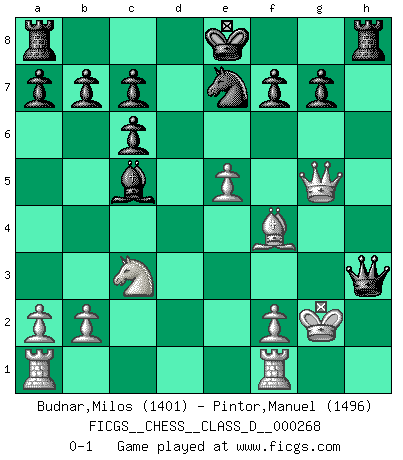 Last move : 0-1 2020 August 18 10:14:13 [Event "FICGS__CHESS__CLASS_D__000268"] [Site "FICGS"] [Date "2020.08.02"] [Round "1"] [White "Budnar,Milos"] [Black "Pintor,Manuel"] [Result "0-1"] [WhiteElo "1401"] [BlackElo "1496"] 1.e4 e5 2.Nf3 Nc6 3.Bb5 Qf6 4.c3 Bc5 5.d4 exd4 6.e5 Qg6 7.O-O dxc3 8.Nxc3 Nge7 9.Bxc6 dxc6 10.h3 Bxh3 11.Ng5 Bxg2 12.Kxg2 h6 13.Qg4 hxg5 14.Qxg5 Qh7 15.Bf4 Qh3+ 0-1 Ruy Lopez (Spanish Opening) Kingside Castling by player White (move 7) Player Black won this chess game. Follow this game move after move (download)It is the aim of the modern school, not to treat every position according to one general law, but according to the principle inherent in the position. (Richard Reti) Lisa Lane, amerikanische Schachmeisterin, hatte Fischer einmal als stärksten lebenden Spieler bezeichnet. Antwort: Das ist richtig, aber Lisa Lane ist eigentlich nicht in der Lage, das zu beurteilen. (Robert James Fischer) Un entendimiento a fondo de las continuaciones típicas del mate, hace de las combinaciones de sacrificio mas complicadas conducirlas a ellas no solo sin dificultad, sino casi de una manera natural. (Siegbert Tarrasch) Il (Jacob Murray) ne joue pas pour le bon coup, mais pour le meilleur. (Eloi Relange) First of all, we have to go back to the classical time control. (Anatoly Karpov)