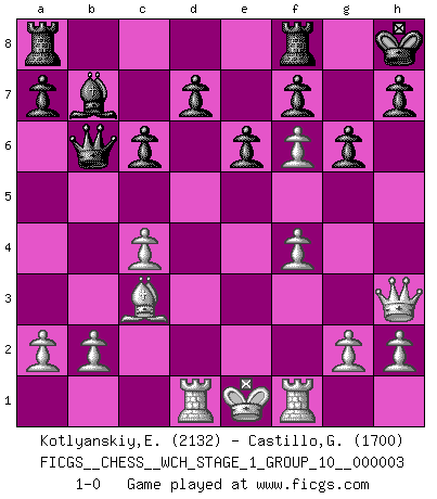 Last move : 1-0 2007 July 21 3:56:21 [Event "FICGS__CHESS__WCH_STAGE_1_GROUP_10__000003"] [Site "FICGS"] [Date "2007.07.11"] [Round "1"] [White "Kotlyanskiy,Edward"] [Black "Castillo,German"] [Result "1-0"] [WhiteElo "2132"] [BlackElo "1700"] 1.e4 c5 2.Nf3 Nc6 3.Nc3 e6 4.d4 cxd4 5.Nxd4 Nf6 6.Nxc6 bxc6 7.e5 Nd5 8.Ne4 Qc7 9.f4 Qb6 10.c4 Ne3 11.Qd3 Bb4+ 12.Bd2 O-O 13.Rc1 Nxf1 14.Rxf1 Be7 15.Bc3 Bb7 16.Nf6+ Bxf6 17.exf6 g6 18.Qh3 Kh8 19.Rd1 1-0 Sicilian defense Kingside Castling by player Black (move 12) Player White won this chess game. Follow this game move after move (download)A player surprised is half beaten. (Proverb) Habe Mut, dich deines eigenen Verstandes zu bedienen. (Immanuel Kant) ¿Que sería del Ajedrez sin errores graciosos?. (Kurt Richter) Nous sommes les pions de la mystérieuse partie d'Echecs jouée par Dieu. Il nous déplace, nous arrête, nous pousse encore, puis nous lance un à un dans la boîte du Néant. Epitaphe sur la tombe de David Janowsky (1868-1927). Political correctness is subjecting us to gross incompetence. (Johann Piek)