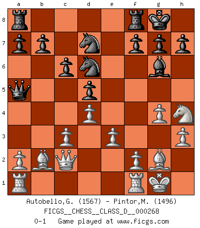 Last move : 0-1 2020 October 26 18:1:0 [Event "FICGS__CHESS__CLASS_D__000268"] [Site "FICGS"] [Date "2020.08.02"] [Round "1"] [White "Autobello,Giovanni"] [Black "Pintor,Manuel"] [Result "0-1"] [WhiteElo "1567"] [BlackElo "1496"] 1.d4 d5 2.c4 c6 3.Nc3 Nf6 4.Nf3 Bg4 5.e3 e6 6.g3 Bb4 7.Bg2 Ne4 8.Qc2 O-O 9.O-O Bxc3 10.bxc3 Qa5 11.Bb2 Nd7 12.cxd5 exd5 13.h3 Bf5 14.g4 Bg6 15.Nh4 Nd6 0-1 This chess game has been lost on time (started : 2020.08.02 12:10:22) QGD Slav defense Kingside Castling by player Black (move 8) Kingside Castling by player White (move 9) Player Black won this chess game. Follow this game move after move (download)If you aren't afraid of Spassky, then I have removed the element of money. (Jim Slater) Wenn Du einsam bist, wenn Du Dich in der Welt wie ein Fremder fühlst, spiele Schach. Das wird Deinen Geist erheben und Dein Ratgeber im Kampf sein. (Aristoteles) ¿Se han dado cuenta de que Fischer casi nunca ha tenido piezas malas? El las intercambia y las piezas malas se quedan con sus oponenets. (Yuri Balashov) On croit qu'il y a plus de mauvais joueurs que de bons joueurs, c'est faux : Il y a autant de joueurs qui gagnent que de joueurs qui perdent. (Philippe Geluck) Nothing is more important for teaching us to understand the concepts we have than constructing fictitious ones. (Ludwig Wittgenstein)
