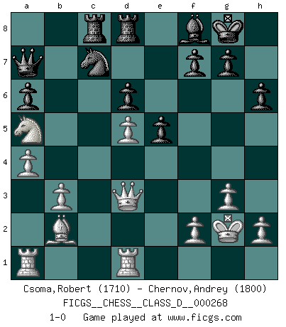 Last move : 1-0 2020 November 13 2:9:44 [Event "FICGS__CHESS__CLASS_D__000268"] [Site "FICGS"] [Date "2020.08.02"] [Round "1"] [White "Csoma,Robert"] [Black "Chernov,Andrey"] [Result "1-0"] [WhiteElo "1710"] [BlackElo "1800"] 1.e4 c5 2.Nf3 a6 3.d4 cxd4 4.Nxd4 e5 5.Nf3 Nf6 6.Nbd2 d6 7.g3 Be7 8.Bg2 O-O 9.O-O Nc6 10.c3 Bg4 11.Qc2 Qd7 12.b3 Rac8 13.Ba3 Rfd8 14.c4 h6 15.Qd3 Bh3 16.Rfd1 Bxg2 17.Kxg2 Na7 18.Nf1 Qc6 19.N3d2 b5 20.Ne3 Bf8 21.cxb5 Nxb5 22.Bb2 Qb7 23.Nd5 Nxd5 24.exd5 Qd7 25.Nc4 Qb7 26.a4 Nc7 27.Na5 Qb6 28.Nc4 Qa7 29.Na5 1-0 Follow this game move after move (download)I am still a victim of Chess. It has all the beauty of art and much more. It cannot be commercialized. Chess is much purer than art in its social position. (Marcel Duchamp) Ich verachte Kasparow. (Viktor Kortschnoi) Un Peón pasado es un criminal, quién debe ser mantenido bajo candado y llave. Leves medidas, tales como vigilancia policiaca, no son suficientes. (Aaron Nimzovich) Mon pion favori sur ma case favorite ! Bronstein en parlant d'un coup de pion en h5 quand il avait les Noirs. You can think I'm wrong, but that's no reason to quit thinking. (Gregory House, House M.D.)