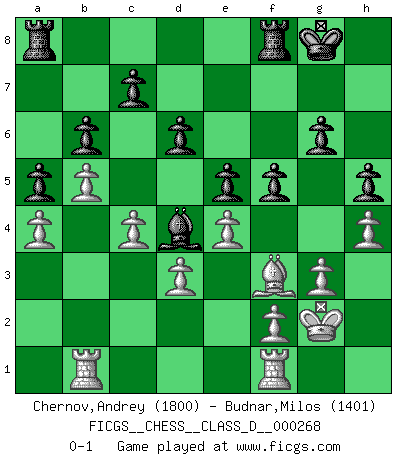 Last move : 0-1 2020 November 11 19:55:8 [Event "FICGS__CHESS__CLASS_D__000268"] [Site "FICGS"] [Date "2020.08.02"] [Round "1"] [White "Chernov,Andrey"] [Black "Budnar,Milos"] [Result "0-1"] [WhiteElo "1800"] [BlackElo "1401"] 1.e4 e5 2.Nf3 Nc6 3.Be2 Nf6 4.Nc3 Bb4 5.Nd5 Ba5 6.Nxf6+ Qxf6 7.O-O O-O 8.d3 h6 9.c4 d6 10.a3 Bg4 11.b4 Bb6 12.Bb2 Bxf3 13.Bxf3 Nd4 14.Bxd4 Bxd4 15.Rb1 b6 16.b5 a6 17.a4 a5 18.g3 g6 19.Bg2 h5 20.Qf3 Qxf3 21.Bxf3 Bc3 22.h4 Bd4 23.Kg2 f5 0-1 Follow this game move after move (download)Weak points or holes in the opponent's position must be occupied by pieces not Pawns. (Siegbert Tarrasch) Bogoljubow: Matt in vier Zügen! Tartakower: Ich verbitte mir jede Belästigung! (Savielly Grigorievitsch Tartakower) Aquel que ve no otra dirección en el juego que la de dar Jaque Mate a su oponente, nunca será un buen jugador de Ajedrez. (Euwe) Le thème de l'attaque double intervient d'une manière ou d'une autre dans l'immense majorité des combinaisons. (Youri Averbakh) The hypothalamus is one of the most important parts of the brain, involved in many kinds of motivation, among other functions. The hypothalamus controls the 'Four Fs: Fighting, Fleeing, Feeding and Mating. (Unknown author)