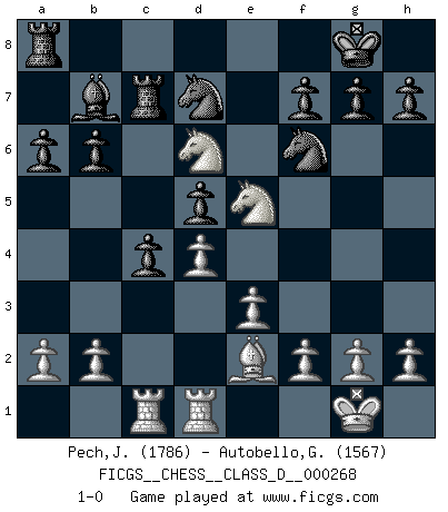 Last move : 1-0 2020 December 31 12:57:48 [Event "FICGS__CHESS__CLASS_D__000268"] [Site "FICGS"] [Date "2020.08.02"] [Round "1"] [White "Pech,Jaroslav"] [Black "Autobello,Giovanni"] [Result "1-0"] [WhiteElo "1786"] [BlackElo "1567"] 1.c4 Nf6 2.Nc3 b6 3.d4 Bb7 4.Qc2 d5 5.Nf3 e6 6.cxd5 exd5 7.Bf4 Bd6 8.Bxd6 Qxd6 9.e3 O-O 10.Be2 Nbd7 11.Nb5 Qb4+ 12.Qc3 Qxc3+ 13.Nxc3 c5 14.O-O Rfe8 15.Nb5 Rec8 16.Nd6 Rc7 17.Rfd1 a6 18.Rac1 c4 19.Ne5 1-0 This chess game has been lost on time (started : 2020.08.02 12:10:22) Follow this game move after move (download)Botvinnik tried to take the mystery out of Chess, always relating it to situations in ordinary life. He used to call Chess a typical inexact problem similar to those which people are always having to solve in everyday life. (Garry Kasparov) Über Kasparov: Es ist offensichtlich, daß er in einem totalitären Staat aufwuchs und deshalb zu diktatorischen Zügen neigt. (Viktor Kortschnoi) Por tratar de evitar la pérdida de una pieza, muchas personas han perdido una partida de Ajedrez. (Savielly Tartakover) Le pion, dans sa simplicité, marche droit devant lui, mais lorsqu'il prend, il le fait obliquement? Ainsi l'homme, tant qu'il reste pauvre, marche dans la droiture et vit honnêtement, mais lorsqu'il recherche les honneurs, il flatte, se parjure et, par les voies obliques, cherche une position supérieure sur l'échiquier du monde. (Jean de Galles) Don't be discouraged. It's often the last key in the bunch that opens the lock. (Author unknown)