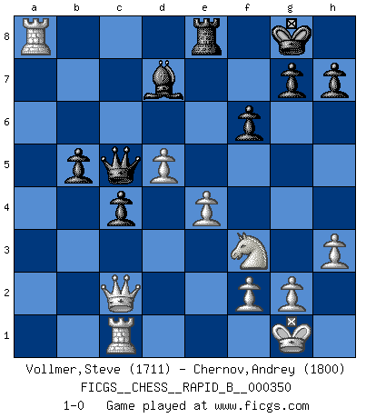 Last move : 1-0 2020 October 19 21:21:54 [Event "FICGS__CHESS__RAPID_B__000350"] [Site "FICGS"] [Date "2020.08.03"] [Round "1"] [White "Vollmer,Steve"] [Black "Chernov,Andrey"] [Result "1-0"] [WhiteElo "1711"] [BlackElo "1800"] 1.d4 d5 2.c4 dxc4 3.e3 e6 4.Bxc4 a6 5.a4 Nf6 6.Nf3 Be7 7.Nc3 O-O 8.O-O Nc6 9.b3 Bd7 10.Bb2 Na5 11.Qe2 Nxc4 12.bxc4 c5 13.Rfd1 Qc7 14.d5 exd5 15.Nxd5 Nxd5 16.cxd5 Bd6 17.h3 b5 18.axb5 axb5 19.e4 f6 20.Rdc1 c4 21.Nd4 Be5 22.Nf3 Bd6 23.Bd4 Rfe8 24.Qc2 Bc5 25.Bxc5 Qxc5 26.Rxa8 1-0 This chess game has been lost on time (started : 2020.08.03 12:22:58) Queen's gambit accepted Kingside Castling by player Black (move 7) Kingside Castling by player White (move 8) Player White won this chess game. Follow this game move after move (download)In Chess, just as in life, today's bliss may be tomorrow's poison. (Assaic) Mit Schach schule ich mein Gefühl für Geometrie, was für Tennis und Schach gleichermaßen wichtig ist. (Boris Becker) Combinaciones deslumbrantes son para la mayoría, mover madera es para los pocos. (Georg Kieninger) Toutes choses étant égales, c'est la conviction qui gagne. Alliée à une volonté de vaincre, elle sert de détonateur, suscite des idées, disperse les doutes et aide à penser clairement. (Robert Fischer) May the force be with you. (Han Solo in Star Wars ep.4)