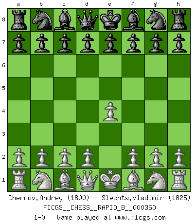 Last move : 1-0 2020 September 2 15:28:56 [Event "FICGS__CHESS__RAPID_B__000350"] [Site "FICGS"] [Date "2020.08.03"] [Round "1"] [White "Chernov,Andrey"] [Black "Slechta,Vladimir"] [Result "1-0"] [WhiteElo "1800"] [BlackElo "1825"] 1.e4 1-0 This chess game has been lost on time (started : 2020.08.03 12:22:58) King's pawn Opening Player White won this chess game. Follow this game move after move (download)Bobby just drops the pieces and they fall on the right squares. (Miguel Najdorf) Frage: Gibt es etwas was Sie mehr lieben als Autobahnen ohne Tempobegrenzungen? - Antwort: Deutsche Frauen ohne Tempobegrenzungen. (Loek van Wely) Las leyes del Ajedrez no permiten una libre elección: tienes que mover quieras o no. (Emanuel Lasker) Mais n'est-ce pas déjà le limiter injurieusement que d'appeler les échecs un jeu? N'est-ce pas aussi une science, un art, ou quelque chose qui, comme le cercueil de Mahomet entre ciel et terre, est suspendu entre l'un et l'autre, et qui réunit un nombre incroyable de contraires ? (Stefan Zweig) If we knew what we were doing, we would not call it research. (Albert Einstein)