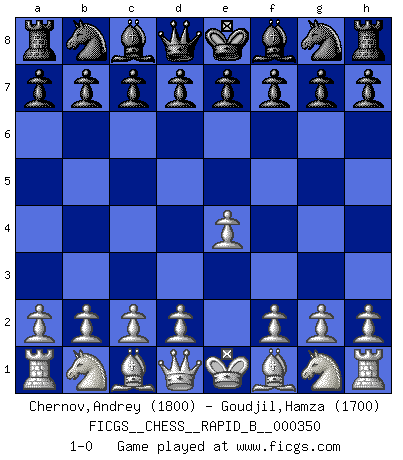Last move : 1-0 2020 September 2 15:28:56 [Event "FICGS__CHESS__RAPID_B__000350"] [Site "FICGS"] [Date "2020.08.03"] [Round "1"] [White "Chernov,Andrey"] [Black "Goudjil,Hamza"] [Result "1-0"] [WhiteElo "1800"] [BlackElo "1700"] 1.e4 1-0 This chess game has been lost on time (started : 2020.08.03 12:22:58) King's pawn Opening Player White won this chess game. Follow this game move after move (download)Look at Garry Kasparov. After he loses, invariably he wins the next game. He just kills the next guy. That's something that we have to learn to be able to do. (Maurice Ashley) Über Karpov: Er war und ist ein Vertreter der russischen Reaktionäre. Das steckt tief in seiner Seele, wehalb ich nicht nett mit ihm umgehen kann. (Viktor Kortschnoi) En el Ajedrez, tal como es jugado por los Maestros, practicamente la suerte es eliminada. (Emanuel Lasker) Le plus grand jeu de l'esprit jamais inventé, plus vous l'apprenez, plus vous y prenez du plaisir. (Garry Kasparov) If you ain't just a little scared when you enter a casino, you are either very rich or you haven't studied the games enough. (Pappy)