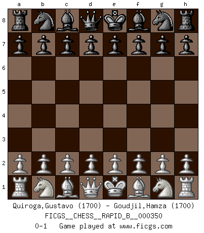 Last move : 0-1 2020 September 2 15:28:56 [Event "FICGS__CHESS__RAPID_B__000350"] [Site "FICGS"] [Date "2020.08.03"] [Round "1"] [White "Quiroga,Gustavo"] [Black "Goudjil,Hamza"] [Result "0-1"] [WhiteElo "1700"] [BlackElo "1700"] 0-1 This chess game has been lost on time (started : 2020.08.03 12:22:58) Player Black won this chess game. Follow this game move after move (download)Bobby Fischer is the greatest Chess genius of all time ! (Alexander Kotov) Karpov ist ein Museumsstück. (Garry Kasparov) El ganador de una partida es aquel jugador que hace el penúltimo error. (Savielly Tartakover) Le génie consiste à savoir transgresser les règles au moment opportun. (Teichmann) Life is pleasant. Death is peaceful. It's the transition that's troublesome. (Isaac Asimov)