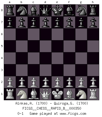 Last move : 0-1 2020 September 2 15:28:56 [Event "FICGS__CHESS__RAPID_B__000350"] [Site "FICGS"] [Date "2020.08.03"] [Round "1"] [White "Alnkas,Alsyedbonok"] [Black "Quiroga,Gustavo"] [Result "0-1"] [WhiteElo "1700"] [BlackElo "1700"] 0-1 This chess game has been lost on time (started : 2020.08.03 12:22:58) Player Black won this chess game. Follow this game move after move (download)Do you realize Fischer almost never has any bad pieces? He exchanges them, and the bad pieces remain with his opponents. (Yuri Balashov) Meine Liebe ist Schach, Schach, Schach. Ich muss jeden Tag Schach spielen, deshalb fühle ich mich so stark. (Miguel Najdorf) Haz el enroque temprano y seguido. (Rob Sillars) Toutes choses étant égales, c'est la conviction qui gagne. Alliée à une volonté de vaincre, elle sert de détonateur, suscite des idées, disperse les doutes et aide à penser clairement. (Robert Fischer) The Internet is so big, so powerful and pointless that for some people it is a complete substitute for life. (Andrew Brown)