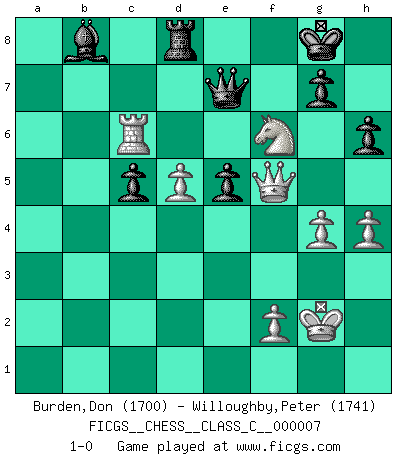 Last move : 1-0 2006 July 22 20:29:1 [Event "FICGS__CHESS__CLASS_C__000007"] [Site "FICGS"] [Date "2006.06.21"] [Round "1"] [White "Burden,Don"] [Black "Willoughby,Peter"] [Result "1-0"] [WhiteElo "1700"] [BlackElo "1741"] 1.e4 e5 2.Nf3 Nc6 3.Bc4 Bc5 4.b4 Bb6 5.a4 a6 6.c3 Nf6 7.d3 d6 8.O-O O-O 9.Bg5 Nb8 10.a5 Ba7 11.h3 b5 12.axb6 Bxb6 13.b5 Bb7 14.Nbd2 axb5 15.Rxa8 Bxa8 16.Bxb5 c6 17.Bc4 Nbd7 18.d4 Qe7 19.d5 cxd5 20.Bxd5 Bxd5 21.exd5 Ra8 22.Qb3 Rb8 23.Qc2 Qf8 24.Bxf6 Nxf6 25.c4 h6 26.Ne4 Nxe4 27.Qxe4 Qd8 28.g4 Ra8 29.Rc1 Qc7 30.Kg2 Ra2 31.Rc2 Qa7 32.Qe2 Ra4 33.Nd2 Qd7 34.Ne4 Ra8 35.Ra2 Rb8 36.Ra6 Kh8 37.Qb2 Bc7 38.Qa3 Rd8 39.Rc6 Bb8 40.Qf3 f6 41.Qf5 Qe7 42.h4 Kg8 43.c5 dxc5 44.Nxf6+ 1-0 Comment by player 2 : Peter Willoughby : Well played Evans gambit declined, 5.a4 Kingside Castling by player White (move 8) Kingside Castling by player Black (move 8) Player White won this chess game. Follow this game move after move (download)In the perfect Chess combination as in a first-rate short story, the whole plot and counter-plot should lead up to a striking finale, the interest not being allayed until the very last moment. (Yates and Winter) Ich bewundere Kasparows phantasievolle Angriffssiege aus den Achtzigern und Neunzigern, aber wenn man sie mit dem Computer überprüft, nimmt der Computer in jeder zweiten Partie die Opfer an, verteidigt sich und gewinnt. (Vladimir Kramnik) Ciertamente, de todas la drogas del mundo, el Ajedrez debe ser el mas placentero permamentemente. (Assiac) Un journaliste : 'Vous préférez avoir une dame de plus sur l'échiquier ou au lit ?' Boris Spassky : 'Ca dépend de la position.' God is an atheist. (Unknown)