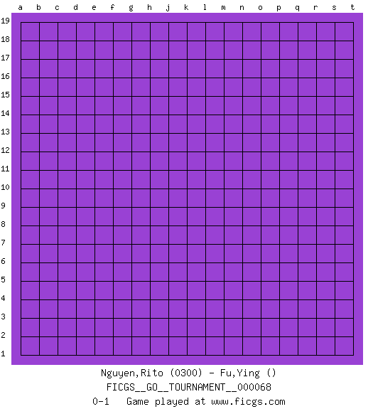 Last move : 0-1 2020 September 12 4:18:46 [Event "FICGS__GO__TOURNAMENT__000068"] [Site "FICGS"] [Date "2020.08.13"] [Round "1"] [Black "Nguyen,Rito"] [White "Fu,Ying"] [Result "0-1"] [Rating 1 "0300"] 0-1 This go game has been lost on time (started : 2020.08.13 1:46:26) Here are the names of the openings (joseki) played in the four corners : Player White won this Go (weiqi, baduk) game. Follow this game move after move (download)In the sound of the stone you can hear its purpose. (Pierre Audouard) Luck is when opportunity knocks and you answer. (Anonymous)