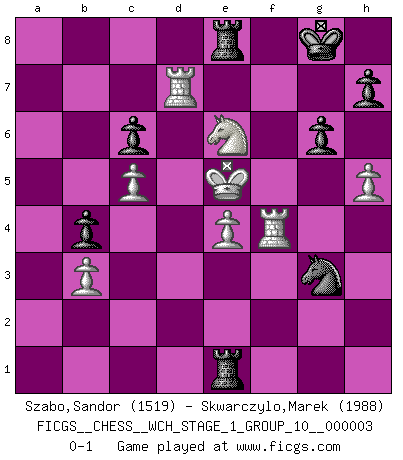 Last move : 0-1 2007 December 27 9:56:39 [Event "FICGS__CHESS__WCH_STAGE_1_GROUP_10__000003"] [Site "FICGS"] [Date "2007.07.11"] [Round "1"] [White "Szabo,Sandor"] [Black "Skwarczylo,Marek"] [Result "0-1"] [WhiteElo "1519"] [BlackElo "1988"] 1.d4 Nf6 2.c4 g6 3.Nc3 Bg7 4.e4 O-O 5.Nf3 d6 6.Be2 e5 7.dxe5 dxe5 8.Qxd8 Rxd8 9.Bg5 Nbd7 10.O-O-O Rf8 11.Nd2 c6 12.Be3 Re8 13.g4 Nf8 14.Rhg1 b6 15.g5 N6d7 16.Nb3 f5 17.gxf6 Nxf6 18.c5 b5 19.Na5 Bd7 20.b4 Rac8 21.Rd2 Ne6 22.Bd1 Rc7 23.f3 Kf8 24.Ne2 Nd8 25.Bb3 Nb7 26.Nxb7 Rxb7 27.Rd6 Ra8 28.Rgd1 Be8 29.Ng3 a5 30.bxa5 Rxa5 31.Bg5 Ng8 32.f4 exf4 33.Bxf4 Bh6 34.Ne2 Kg7 35.Rf1 Bf7 36.Kb2 Bxf4 37.Rxf4 Bxb3 38.axb3 Ne7 39.Nd4 Ra8 40.Kc3 Rc8 41.Rf2 Ra7 42.Ne6+ Kg8 43.Kd4 Re8 44.h4 Ra1 45.Ke5 Re1 46.Rd7 Nf5 47.Rf4 b4 48.h5 Ng3 0-1 This chess game has been lost on time (started : 2007.07.11 17:4:38) King's Indian : 4.e4 Kingside Castling by player Black (move 4) Queenside Castling by player White (move 10) Player Black won this chess game. Follow this game move after move (download)Mistrust is the most necessary characteristic of the Chess player. (Siegbert Tarrasch) Ich kenne keine einzige Person, die behaupten würde, Garri Kasparow sei ein guter Mensch (Nigel Short) Cuando tengo las piezas blancas, yo gano porque soy blanco; Cuando tengo las piezas negras, yo gano porque soy Bogolyubov. (Bogolyubov) Les pièces de l'échiquier étaient impitoyables. Elles le retenaient, elles l'absorbaient. Il y avait de l'horreur en cela, mais aussi une harmonie unique. Car, qu'y a-t-il dans le monde, à part les échecs ? (V. Nabokov) Strategy without tactics is the slowest route to victory. Tactics without strategy is the noise before defeat. (Sun Tzu)