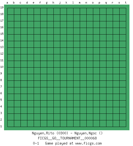 Last move : 0-1 2020 September 12 4:18:46 [Event "FICGS__GO__TOURNAMENT__000068"] [Site "FICGS"] [Date "2020.08.13"] [Round "1"] [Black "Nguyen,Rito"] [White "Nguyen,Ngoc"] [Result "0-1"] [Rating 1 "0300"] 0-1 This go game has been lost on time (started : 2020.08.13 1:46:26) Here are the names of the openings (joseki) played in the four corners : Player White won this Go (weiqi, baduk) game. Follow this game move after move (download)Play slow, win slow; play fast, lose fast. (Anonymous) Experience is the name we all give to our mistakes. (Oscar Wilde)