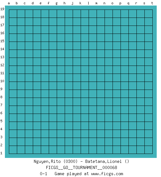 Last move : 0-1 2020 September 12 4:18:46 [Event "FICGS__GO__TOURNAMENT__000068"] [Site "FICGS"] [Date "2020.08.13"] [Round "1"] [Black "Nguyen,Rito"] [White "Batetana,Lionel"] [Result "0-1"] [Rating 1 "0300"] 0-1 This go game has been lost on time (started : 2020.08.13 1:46:26) Here are the names of the openings (joseki) played in the four corners : Player White won this Go (weiqi, baduk) game. Follow this game move after move (download)Beware of the clumsy double contact. (Anonymous) The bottom line is always the bottom line. (Johann Piek)