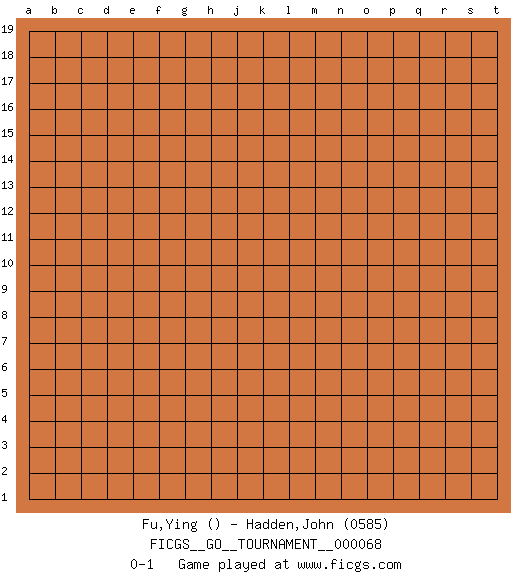 Last move : 0-1 2020 September 12 4:18:46 [Event "FICGS__GO__TOURNAMENT__000068"] [Site "FICGS"] [Date "2020.08.13"] [Round "1"] [Black "Fu,Ying"] [White "Hadden,John"] [Result "0-1"] [Rating 2 "0585"] 0-1 This go game has been lost on time (started : 2020.08.13 1:46:26) Here are the names of the openings (joseki) played in the four corners : Player White won this Go (weiqi, baduk) game. Follow this game move after move (download)Keep away from thickness. (Anonymous) I just play for fun. (Anna Kournikova)