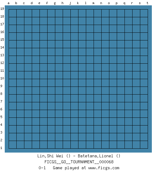 Last move : 0-1 2020 September 12 4:18:46 [Event "FICGS__GO__TOURNAMENT__000068"] [Site "FICGS"] [Date "2020.08.13"] [Round "1"] [Black "Lin,Shi Wei"] [White "Batetana,Lionel"] [Result "0-1"] 0-1 This go game has been lost on time (started : 2020.08.13 1:46:26) Here are the names of the openings (joseki) played in the four corners : Player White won this Go (weiqi, baduk) game. Follow this game move after move (download)The weak player fears ko, the strong player seeks it. (Bill Taylor) There are 10 types of people in this world: those who understand binary and those who don't. (Anonymous)