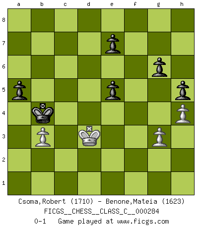 Last move : 0-1 2020 November 22 18:55:57 [Event "FICGS__CHESS__CLASS_C__000284"] [Site "FICGS"] [Date "2020.08.13"] [Round "1"] [White "Csoma,Robert"] [Black "Benone,Mateia"] [Result "0-1"] [WhiteElo "1710"] [BlackElo "1623"] 1.d4 f5 2.Nf3 Nf6 3.g3 g6 4.Bg2 Bg7 5.O-O O-O 6.c4 d6 7.Nc3 Nc6 8.d5 Ne5 9.Nxe5 dxe5 10.e4 Nxe4 11.Nxe4 fxe4 12.Bxe4 Bf5 13.Bg2 Qd7 14.Be3 Bh3 15.Qd2 Bxg2 16.Kxg2 Qf5 17.Bh6 Bxh6 18.Qxh6 Qe4+ 19.Kg1 Qxc4 20.Rac1 Qxa2 21.Rxc7 Rf7 22.Rxb7 Qxd5 23.Rb4 Raf8 24.Ra4 Rxf2 25.Rxf2 Qd1+ 26.Kg2 Rxf2+ 27.Kxf2 Qxa4 28.Qd2 Qd4+ 29.Ke2 Qxd2+ 30.Kxd2 Kf7 31.Ke3 Ke6 32.Ke4 a5 33.b3 h6 34.h3 h5 35.h4 Kd6 36.Kd3 Kd5 37.Ke3 Kc5 38.Kd3 Kb4 0-1 Follow this game move after move (download)Chess holds its master in its own bonds, shackling the mind and brain so that the inner freedom of the very strongest must suffer. (Albert Einstein) Wie kann ich Remis annehmen? Ich weiß ja gar nicht, wie ich stehe! (Fritz Sämisch) No hay un Gran Maestro de Ajedrez que sea normal; solo se diferencían ellos por la magnitud de su locura. (Viktor Korchnoi) Vous n'êtes pas toujours obligé de jouer le meilleur coup. Un coup doit être actif, entreprenant, correct et beau ! (David Bronstein) For to win one hundred victories in one hundred battles is not the acme of skill. To subdue the enemy without fighting is the acme of skill. (Sun Tzu)
