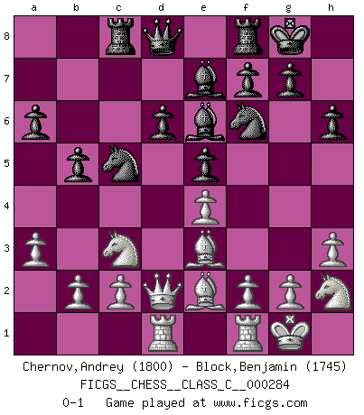Last move : 0-1 2020 November 10 14:3:40 [Event "FICGS__CHESS__CLASS_C__000284"] [Site "FICGS"] [Date "2020.08.13"] [Round "1"] [White "Chernov,Andrey"] [Black "Block,Benjamin"] [Result "0-1"] [WhiteElo "1800"] [BlackElo "1745"] 1.e4 c5 2.Nf3 d6 3.d4 cxd4 4.Nxd4 Nf6 5.Nc3 a6 6.Be2 e5 7.Nf3 Be7 8.O-O O-O 9.Be3 Be6 10.Ng5 Bd7 11.Qd2 h6 12.Nf3 Be6 13.Rad1 Nbd7 14.h3 b5 15.a3 Rc8 16.Nh2 Nc5 0-1 This chess game has been lost on time (started : 2020.08.13 19:16:21) Follow this game move after move (download)Some sacrifices are sound; the rest are mine. (Mikhail Tal) Im Hotelzimmer gab es nur zwei Schaben. (Über die Turnierbedingungen) (Peter Swidler) Una buena memoria, concentración, imaginación y una fuerte voluntad, se requiere para llegar a ser un buen jugador. (Bobby Fischer) Il a essayé de se convaincre qu'il pourrait empêcher toutes les erreurs et ne jamais perdre. L'horreur ! Gary Kasparov au sujet de Robert Fischer. Every vice is only an exaggeration of a necessary and virtuous function. (Ralph Waldo Emerson, Journals 1936)