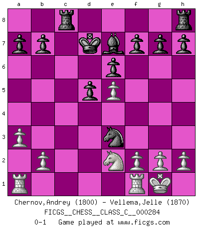 Last move : 0-1 2020 November 11 7:42:17 [Event "FICGS__CHESS__CLASS_C__000284"] [Site "FICGS"] [Date "2020.08.13"] [Round "1"] [White "Chernov,Andrey"] [Black "Vellema,Jelle"] [Result "0-1"] [WhiteElo "1800"] [BlackElo "1870"] 1.e4 e6 2.d4 d5 3.e5 c5 4.c3 Nc6 5.Nf3 Qb6 6.Be2 Nge7 7.O-O cxd4 8.cxd4 Nf5 9.Nc3 Ncxd4 10.Nxd4 Qxd4 11.Bb5+ Bd7 12.Bxd7+ Kxd7 13.Qb3 Qb4 14.Qxb4 Bxb4 15.Ne2 Rac8 16.a3 Be7 17.Be3 Nxe3 0-1 This chess game has been lost on time (started : 2020.08.13 19:16:21) Follow this game move after move (download)The enormous mental resilience, without which no Chess player can exist, was so much taken up by Chess that he could never free his mind of this game. (Albert Einstein) Ich verlor meine Bürgerrechte, mein Gehalt wurde mir nicht mehr bezahlt und ich wurde zensiert und durfte nicht mehr ins Ausland reisen. [nach dem Match Fischer-Taimanov 6:0] (Mark Taimanov) A la fecha, Fischer esta simplemente un nivel arriba de todos los mejores jugadores de Ajedrez del mundo. (John Jacobs) Les Echecs ont trois composantes : le temps, l'espace et le matériel en dernier. (Mikhail Tal) Everything in life is luck. (Donald Trump)
