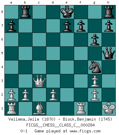 Last move : 0-1 2020 August 29 18:25:52 [Event "FICGS__CHESS__CLASS_C__000284"] [Site "FICGS"] [Date "2020.08.13"] [Round "1"] [White "Vellema,Jelle"] [Black "Block,Benjamin"] [Result "0-1"] [WhiteElo "1870"] [BlackElo "1745"] 1.e4 c5 2.Nc3 d6 3.f4 Nc6 4.Bb5 Bd7 5.Nf3 g6 6.O-O Bg7 7.Qe1 Nd4 8.Bxd7+ Qxd7 9.Nxd4 cxd4 10.Ne2 Qc6 11.Ng3 Qxc2 12.e5 dxe5 13.fxe5 d3 14.Qe4 Qc5+ 15.Kh1 Bxe5 16.Qxb7 Rb8 17.Qa6 Bxg3 18.hxg3 Nh6 19.Qxd3 Ng4 20.Qc3 Qh5+ 0-1 Sicilian : Closed Kingside Castling by player White (move 6) Player Black won this chess game. Follow this game move after move (download)After black's reply to 1.e4 with 1..e5, leaves him always trying to get into the game. (Howard Staunton) Spiel ein langweiliges Spiel zu Ende und lustige Dinge können passieren. (Hans Ree) Una mala movida nulifica cuarenta buenas. (Horowitz) On entre au jeu d'Echecs comme on entre en Religion. Pour le joueur d'Echecs, la partie d'Echecs c'est l'office, la messe, le défilé du 1er Mai, le dépôt de gerbe au Monument aux Morts. C'est un drame sacré. (Michel Roos) If computers get too powerful, we can organize them into committees. That'll do them in. (Anonymous)