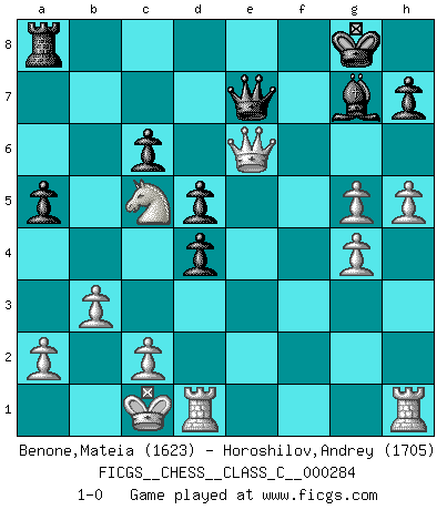 Last move : 1-0 2020 August 21 5:37:3 [Event "FICGS__CHESS__CLASS_C__000284"] [Site "FICGS"] [Date "2020.08.13"] [Round "1"] [White "Benone,Mateia"] [Black "Horoshilov,Andrey"] [Result "1-0"] [WhiteElo "1623"] [BlackElo "1705"] 1.Nf3 g6 2.e4 Bg7 3.d4 d6 4.Nc3 Bg4 5.Be3 Nf6 6.h3 Bxf3 7.Qxf3 Nbd7 8.O-O-O Nb6 9.e5 Nfd7 10.Qxb7 O-O 11.f4 Nc4 12.Bxc4 a5 13.Qf3 Nb6 14.Bb5 d5 15.Bc6 Nc4 16.Bxa8 Qxa8 17.b3 Nxe3 18.Qxe3 Rb8 19.Qf3 c6 20.Na4 Qb7 21.Qc3 Ra8 22.g4 e6 23.h4 f6 24.Nc5 Qe7 25.h5 g5 26.fxg5 fxe5 27.Qe3 exd4 28.Qxe6+ 1-0 Reti Opening Queenside Castling by player White (move 8) Kingside Castling by player Black (move 10) Player White won this chess game. Follow this game move after move (download)A win by an unsound combination, however showy, fills me with artistic horror. (Wilhelm Steinitz) Es ist wirklich schade, dass so viele Schachspieler nicht auf ihr Äußeres achten! (Alexandra Kosteniuk) El Peón aislado arroja penumbra sobre todo el tablero. (Aaron Nimzovich) Toute estimation doit être constamment réévaluée. (Jacob Estrin) Somehow our devils are never quite what we expect when we meet them face to face. (Nelson DeMille)