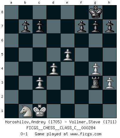 Last move : 0-1 2020 August 22 21:51:20 [Event "FICGS__CHESS__CLASS_C__000284"] [Site "FICGS"] [Date "2020.08.13"] [Round "1"] [White "Horoshilov,Andrey"] [Black "Vollmer,Steve"] [Result "0-1"] [WhiteElo "1705"] [BlackElo "1711"] 1.Nc3 e5 2.d4 exd4 3.Ne4 Nc6 4.Nf3 Bb4+ 5.Bd2 Bxd2+ 6.Qxd2 Nf6 7.Ng3 d5 8.Nxd4 Nxd4 9.Qxd4 Be6 10.O-O-O Qe7 11.f3 O-O 12.e3 a5 13.Bd3 Qb4 14.Qxb4 axb4 15.Kb1 d4 16.exd4 Bxa2+ 17.Kc1 Be6 18.Ne4 Nd5 19.Rde1 Nf4 20.Bf1 Rfd8 21.c3 bxc3 22.bxc3 Ra2 23.Rg1 Rda8 24.Nd2 Ra1+ 25.Nb1 Bf5 26.Re4 Bxe4 27.fxe4 R8a2 28.g3 Ne2+ 29.Bxe2 Rxe2 30.e5 R1a2 31.h3 Rg2 32.Rxg2 Rxg2 33.g4 Rg3 0-1 Dunst (Sleipner-Heinrichsen) Opening Queenside Castling by player White (move 10) Kingside Castling by player Black (move 11) Player Black won this chess game. Follow this game move after move (download)In order to improve your game, you must study the endgame before everything else, for whereas the endings can be studied and mastered by themselves, the middle game and the opening must be studied in relation to the endgame. (Jose Raul Capablanca) Zeige mir drei Eröffnungsvarianten und ich beweise dir, dass zwei davon inkorrekt sind. (Emanuel Lasker) Después de una mala apertura, hay una esperanza en el juego medio. Pero una vez que estas en finales, el momento de la verdad ha llegado. (Edmar Mednis) Si le désir cupide (et stupide) de gagner est une inépuisable source de souffrance, une combinaison brillante sur l'échiquier est une découverte : le coquelicot qui s'épanouit lorsque apparaît la Voie Lactée. (Arrabal) The project of the man are lower than those of the sky. (Chinese proverb)