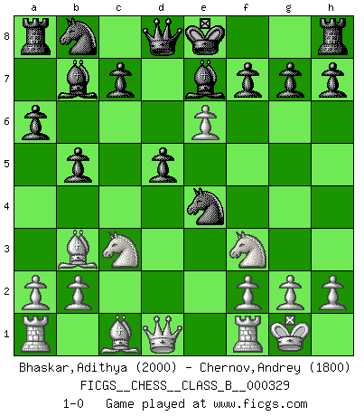 Last move : 1-0 2020 November 26 0:4:5 [Event "FICGS__CHESS__CLASS_B__000329"] [Site "FICGS"] [Date "2020.08.13"] [Round "1"] [White "Bhaskar,Adithya"] [Black "Chernov,Andrey"] [Result "1-0"] [WhiteElo "2000"] [BlackElo "1800"] 1.d4 d5 2.c4 dxc4 3.e4 e6 4.Bxc4 a6 5.Nf3 b5 6.Bb3 Bb7 7.O-O Nf6 8.d5 exd5 9.Nc3 Be7 10.e5 Ne4 11.e6 1-0 Follow this game move after move (download)A passed Pawn increases in strength as the number of pieces on the board diminishes. (Capablanca) Dass jemand wie Surab Asmaiparaschwili, der selbst Elopunkte gekauft hat , Vize-Präsident der Fide werden konnte, sagt schon einges über den Zustand dieser Organisation aus. (Joel Lautier) Todos los Maestros de Ajedrez fueron un día unos principiantes. (Chernev) Aidez vos pièces, elles vous aideront. (Paul Morphy) A good programmer is someone who always looks both ways before crossing a one-way street. (Doug Linder)