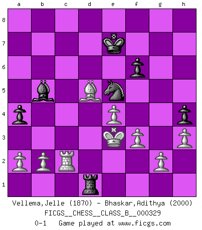 Last move : 0-1 2021 January 14 17:29:42 [Event "FICGS__CHESS__CLASS_B__000329"] [Site "FICGS"] [Date "2020.08.13"] [Round "1"] [White "Vellema,Jelle"] [Black "Bhaskar,Adithya"] [Result "0-1"] [WhiteElo "1870"] [BlackElo "2000"] 1.e4 c5 2.Nc3 Nc6 3.Bb5 Nd4 4.Bc4 e6 5.Nf3 a6 6.Nxd4 cxd4 7.Ne2 Bc5 8.d3 Ne7 9.Bb3 d5 10.O-O dxe4 11.dxe4 b5 12.c3 dxc3 13.Qxd8+ Kxd8 14.Nxc3 Bb7 15.Bf4 Ng6 16.Bg3 h5 17.Rac1 Rc8 18.Rfd1+ Ke7 19.Nxb5 e5 20.Rxc5 Rxc5 21.Nd6 Bc8 22.Nxf7 Rf8 23.Nxe5 Nxe5 24.Bh4+ Rf6 25.Bxf6+ gxf6 26.f3 h4 27.Rd2 Rc1+ 28.Kf2 Rb1 29.Ke3 a5 30.h3 a4 31.Bd5 Ba6 32.Rc2 Re1+ 33.Kd4 Rd1+ 34.Ke3 Bb5 0-1 Follow this game move after move (download)In the perfect Chess combination as in a first-rate short story, the whole plot and counter-plot should lead up to a striking finale, the interest not being allayed until the very last moment. (Yates and Winter) Garry Kasparov war erst in der Großmeister-Organisation GMA, dann in der Profischach-Vereinigung PCA, zum Schluss kehrte er wieder in den Schoß der FIDE zurück. Aber gut, manche Leute sind flexibel (Viswanathan Anand) De todos mis libros Rusos, la defensa contiene y difunde el 'calor' mas grande que pudiese verse extraño al observar lo supremamente abstracto que el Ajedrez supuestamente es. (Vladimir Nabokov) Il a essayé de se convaincre qu'il pourrait empêcher toutes les erreurs et ne jamais perdre. L'horreur ! Gary Kasparov au sujet de Robert Fischer. Without enthusiasm, virtue functions not at all, and vice only poorly. (Mignon McLaughlin, The Neurotic's Notebook, 1960)