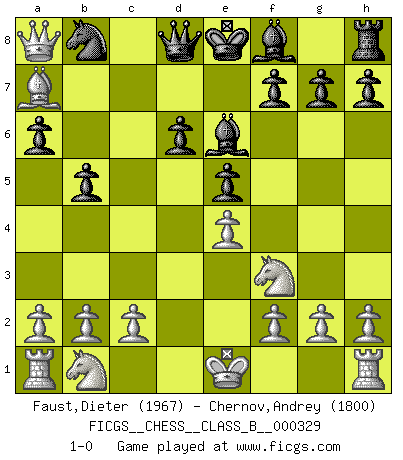 Last move : 1-0 2020 September 1 21:56:53 [Event "FICGS__CHESS__CLASS_B__000329"] [Site "FICGS"] [Date "2020.08.13"] [Round "1"] [White "Faust,Dieter"] [Black "Chernov,Andrey"] [Result "1-0"] [WhiteElo "1967"] [BlackElo "1800"] 1.e4 c5 2.Nf3 a6 3.d4 cxd4 4.Nxd4 e5 5.Nf3 Nf6 6.Bc4 b5 7.Bd5 Ra7 8.Be3 d6 9.Bxa7 Nxd5 10.Qxd5 Be6 11.Qa8 1-0 Sicilian : O'Kelly variation Player White won this chess game. Follow this game move after move (download)Personally, I rather look forward to a computer program winning the world Chess Championship. Humanity needs a lesson in humility. (Richard Dawkings) Der Partner hat auch seine Existenzberechtigung. (Savielly Grigorievitsch Tartakower) El Peón aislado arroja penumbra sobre todo el tablero. (Aaron Nimzovich) Lorsque vous vous retrouvez devant une position atroce, ne tendez pas un ultime piège dérisoire avec l'intention d'abandonner si l'adversaire le déjoue ! Faites-vous plutôt un devoir de résister comme si votre vie en dépendait. Jouez le coup qui vous déplairait au centuple si vous étiez dans la peau de votre tortionnaire ! Go and wake up your luck. (Persian saying)