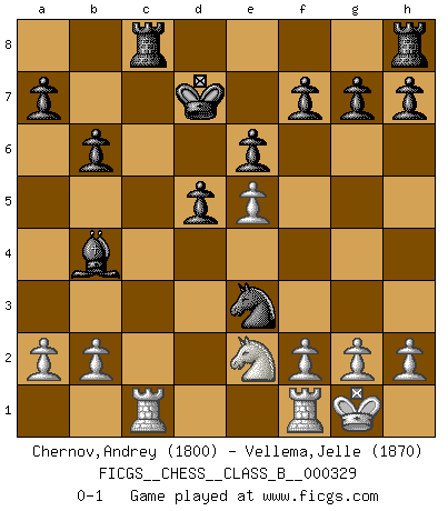 Last move : 0-1 2020 November 11 7:42:17 [Event "FICGS__CHESS__CLASS_B__000329"] [Site "FICGS"] [Date "2020.08.13"] [Round "1"] [White "Chernov,Andrey"] [Black "Vellema,Jelle"] [Result "0-1"] [WhiteElo "1800"] [BlackElo "1870"] 1.e4 e6 2.d4 d5 3.e5 c5 4.c3 Nc6 5.Nf3 Qb6 6.Be2 Nge7 7.O-O cxd4 8.cxd4 Nf5 9.Nc3 Ncxd4 10.Nxd4 Qxd4 11.Bb5+ Bd7 12.Bxd7+ Kxd7 13.Qb3 Qb4 14.Qxb4 Bxb4 15.Ne2 Rac8 16.Be3 b6 17.Rac1 Nxe3 0-1 This chess game has been lost on time (started : 2020.08.13 19:16:51) Follow this game move after move (download)Different people feel differently about resigning. (Bobby Fischer) Capablanka war das größte Genie der Schachgeschichte! Aber denken sie nicht er habe nichts vom Schach verstanden. Er wusste nur soviel wie er wissen musste um seine Ziele zu erreichen. (Mikhail Moiseyevich Botvinik) Yo he agregado estos principios a la ley: pongan los Caballos en acción antes de que los dos Alfiles sean desarrollados. (Emanuel Lasker) Un footballeur joue avec ses pieds, parfois avec sa tête. Un joueur d'échecs ne joue qu'avec sa tête. Et quand il ne joue plus, il meurt. (Jacob Murray) Over-the-board chess is the favorite of mortals, correspondence chess is the favorite of the gods. (Eduard Dyckhoff)