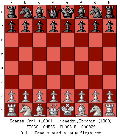 Last move : 0-1 2020 September 23 0:34:26 [Event "FICGS__CHESS__CLASS_B__000329"] [Site "FICGS"] [Date "2020.08.13"] [Round "1"] [White "Soares,Jant"] [Black "Mamedov,Ibrahim"] [Result "0-1"] [WhiteElo "1800"] [BlackElo "1800"] 0-1 This chess game has been lost on time (started : 2020.08.13 19:16:51) Player Black won this chess game. Follow this game move after move (download)Chess is a cold bath for the mind. (Sir John Simon) Rubinstein ist ein Turmendspiel, welches die Götter vor tausenden von Jahren begannen. (Savielly Grigorievitsch Tartakower) Nada excita más a Grandes Maestros aburridos que una novedad teórica. (Dominic Lawson) Dans le domaine de la peinture, de la gravure et de la sculpture, dès la première décennie de notre siècle, les artistes abandonnent la représentation de la partie d'échecs pour se concentrer sur les pièces, sur les échiquiers et sur toutes les variations auxquelles les unes et les autres peuvent donner lieu. On passe en quelque sorte d'un thème social à un thème musical (au sens de la musica médiévale, c'est-à-dire d'une notion qui inclue le rythme, l'harmonie, la construction et la déconstruction, etc.). Graphiquement et picturalement, l'échiquier apparaît comme une structure ouverte, dynamique, d'une richesse infinie, autorisant toutes les combinatoires et débouchant sur des mouvements et des rythmes de nature exponentielle. (Michel Pastoureau) A cynic is a man who knows the price of everything but the value of nothing. (Oscar Wilde)