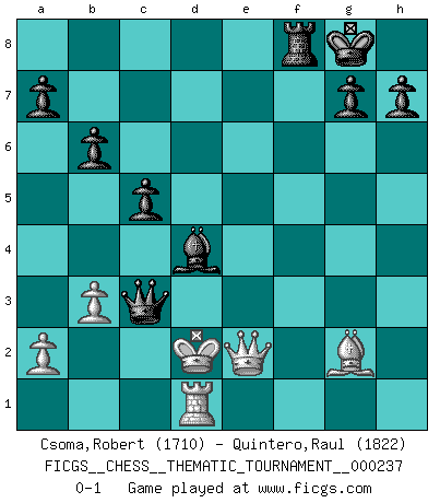 Last move : 0-1 2020 December 1 20:38:18 [Event "FICGS__CHESS__THEMATIC_TOURNAMENT__000237"] [Site "FICGS"] [Date "2020.08.13"] [Round "1"] [White "Csoma,Robert"] [Black "Quintero,Raul"] [Result "0-1"] [WhiteElo "1710"] [BlackElo "1822"] 1.c4 Nf6 2.Nc3 c5 3.g3 d5 4.cxd5 Nxd5 5.Bg2 Nc7 6.Nf3 Nc6 7.O-O e5 8.d3 f6 9.b3 Be7 10.Bb2 O-O 11.Rc1 Bg4 12.Qd2 Qd7 13.Ne4 b6 14.Kh1 f5 15.Nc3 Rad8 16.Qc2 Bxf3 17.exf3 Nb4 18.Qb1 Nxd3 19.Rcd1 Rf6 20.Kg1 Rd6 21.Ne2 Ne6 22.Nc1 Nxb2 23.Rxd6 Qxd6 24.Qxb2 Bf6 25.Bh3 e4 26.Qe2 Nd4 27.Qa6 Nxf3+ 28.Kh1 Bd4 29.Bxf5 Nd2 30.Rd1 e3 31.Bh3 Ne4 32.Nd3 Qc6 33.Bg2 Rf8 34.fxe3 Nxg3+ 35.hxg3 Qh6+ 36.Kg1 Bxe3+ 37.Nf2 Bxf2+ 38.Kf1 Bd4 39.Ke1 Qe3+ 40.Qe2 Qxg3+ 41.Kd2 Qc3+ 0-1 Follow this game move after move (download)I played Chess with him and would have beaten him sometimes only he always took back his last move, and ran the game out differently. (Mark Twain) Wenn sie aufgeben, dann danke ich Ihnen für das Spiel (Eventualzug beim Fernschach). (Anonymous) El Ajedrez es tan interesante por sí solo, que no es necesario un interés monetario para persuadir a una persona a que lo practique; por lo tanto, nunca se juega por dinero. (Benjamin Franklin) La conception d'un plan est le processus par lequel un joueur exploite les avantages de sa position tout en s'efforçant d'en réduire au minimum les inconvénients. Afin de garantir le succès, un plan doit toujours se fonder sur un diagnostic objectif des particularités d'une position. La conception d'un plan est d'autant plus difficile que la position est équilibrée, et grandement facilitée lorsqu'il n'existe qu'un seul plan susceptible de répondre aux exigences de la position. (Harry Golombek) Establishing goals is all right if you don't let them deprive you of interesting detours. (Doug Larson)