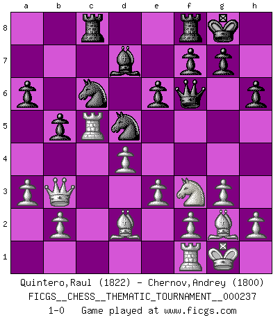 Last move : 1-0 2020 November 19 22:34:27 [Event "FICGS__CHESS__THEMATIC_TOURNAMENT__000237"] [Site "FICGS"] [Date "2020.08.13"] [Round "1"] [White "Quintero,Raul"] [Black "Chernov,Andrey"] [Result "1-0"] [WhiteElo "1822"] [BlackElo "1800"] 1.c4 Nf6 2.Nc3 c5 3.g3 d5 4.cxd5 Nxd5 5.Bg2 Nc7 6.Qb3 Nc6 7.d3 e6 8.Nf3 Be7 9.O-O O-O 10.Bf4 a6 11.a3 h6 12.Rac1 Bd7 13.Ne4 Nd5 14.Nxc5 b5 15.Bd2 Bxc5 16.Rxc5 Qf6 17.e3 Rac8 18.d4 1-0 Follow this game move after move (download)I like to say that Bobby Fischer was the greatest player ever. But what made Fischer a genius was his ability to blend an American freshness and pragmatism with Russian ideas about strategy. (Bruce Pandolfini) Das typische an einem Großmeister ist, daß er eine gewonnene Position schnell und schmerzlos gewinnt. (Irving Chernev) Alekhine es un poeta que crea un trabajo de arte de algo que raramente inspiraría a otra persona a mandar una tarjeta postal. (Max Euwe) Le moment que je préfère le plus dans une rencontre, c'est celui où je sens que la personnalité de l'adversaire se brise. (Robert Fischer) I fear not the man who has practiced 10,000 kicks once, but I fear the man who has practiced one kick 10,000 times. (Bruce Lee)